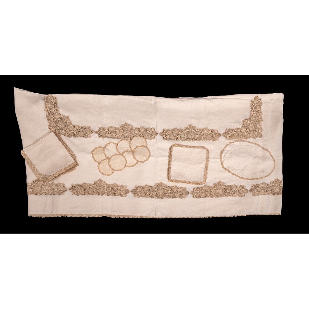 TOVAGLIA in lino nei toni dell' ecrù con pizzo e ricami con otto sottobicchieri, una tovaglietta pane, nove tovaglioli ed otto tovaglioli dessert.