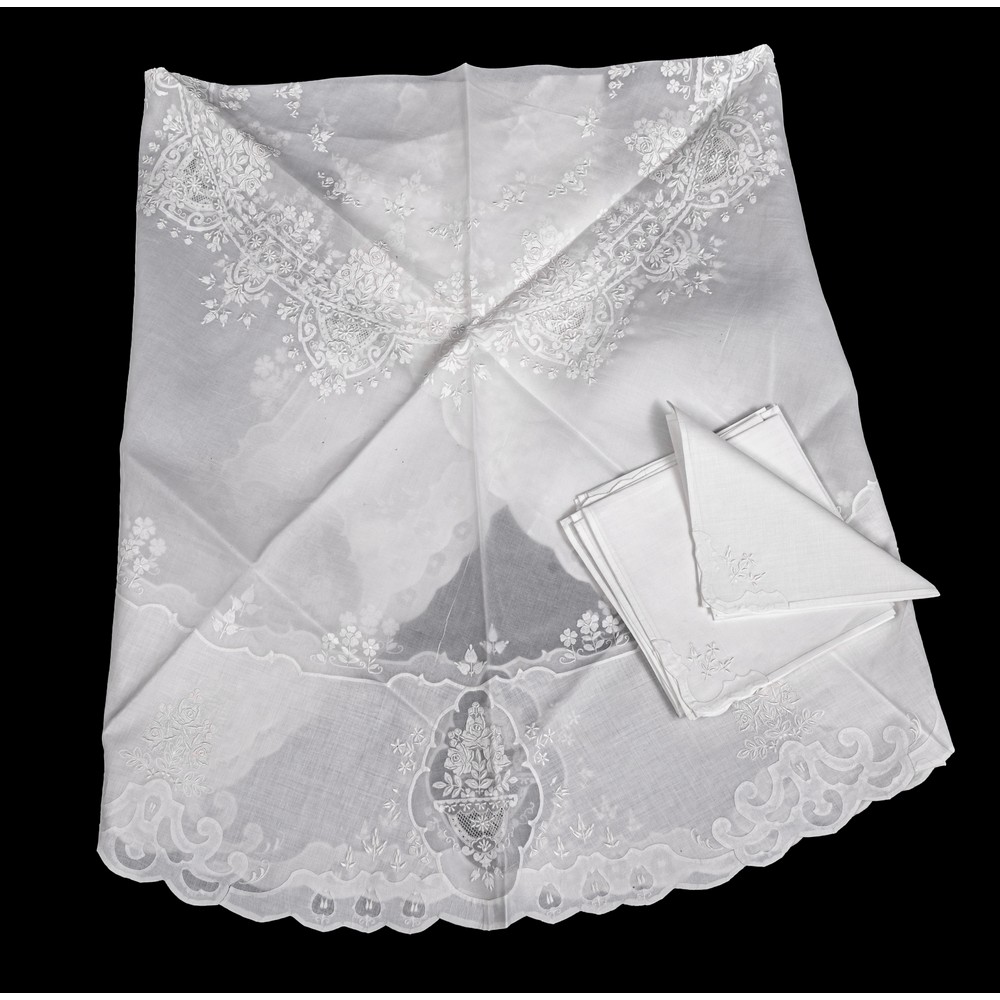 TOVAGLIA circolare con sei tovaglioli in lino nei toni del bianco con ricami a mano.