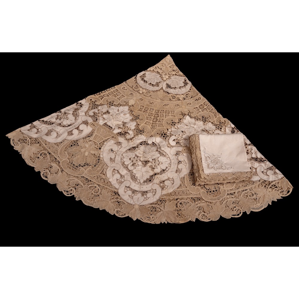 in lino nei toni dell'écru, con inserti e ricami lavorati a mano.