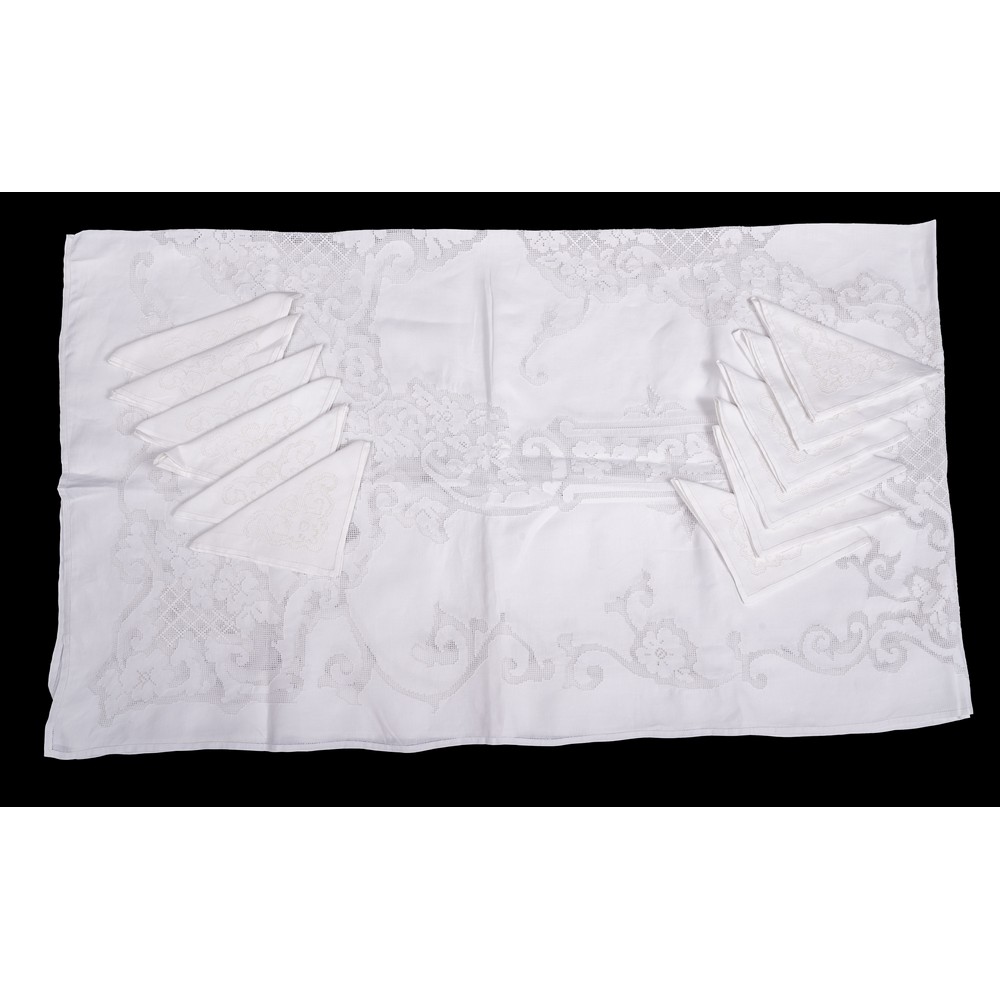TOVAGLIA con 12 tovaglioli in lino nei toni del bianco con ricami a mano.
