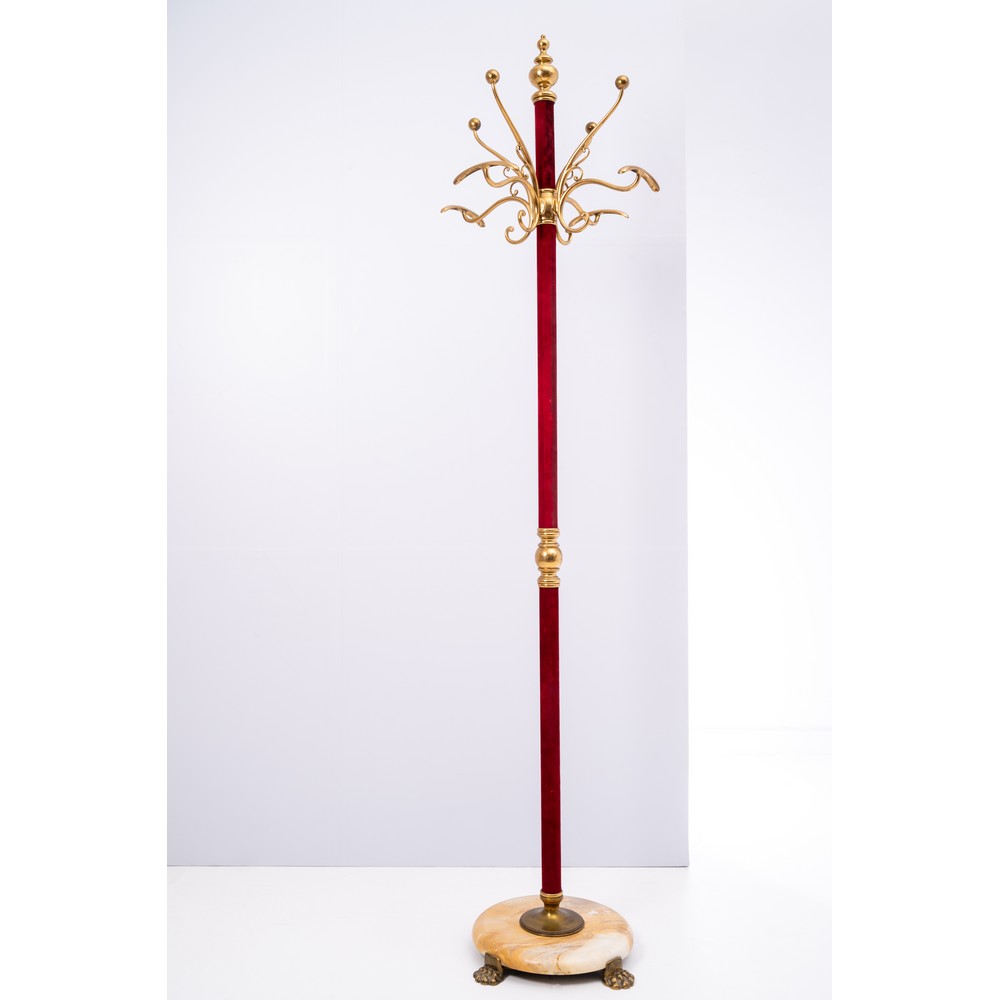 in metallo dorato rivestito nei toni del rosso, base in onice.