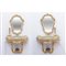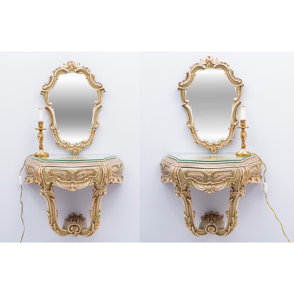 COPPIA DI COMODINI da muro con specchierine di gusto barocco in legno laccato e decorato e due lumetti in metallo dorato.