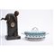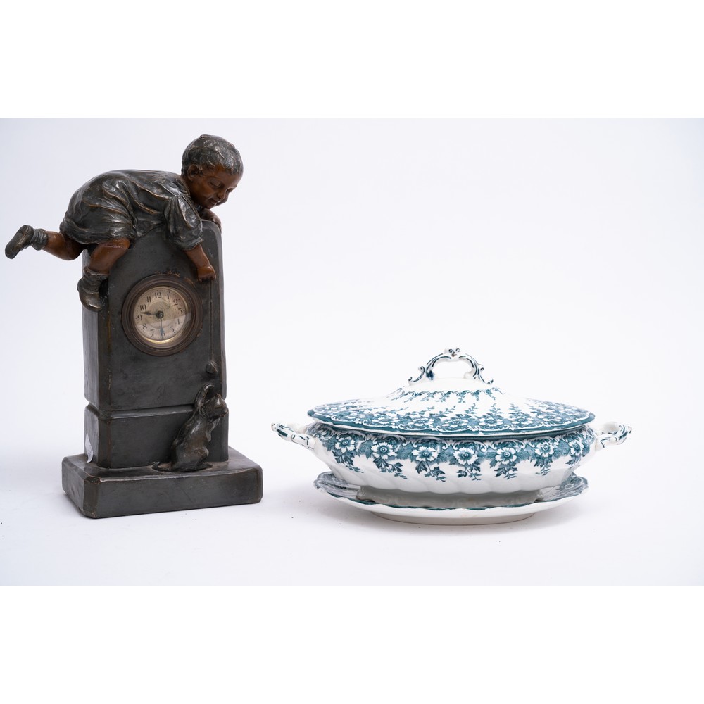 Orologio in terracotta periodo liberty e zuppiera con piatto in porcellana bianca decorata di manifattura Inglese.