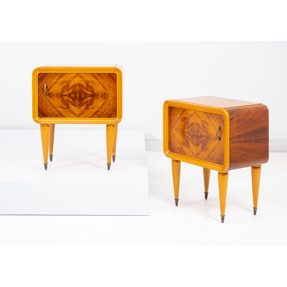 COPPIA DI COMODINI in legno di noce, radica e acero con piani in vetrolite.