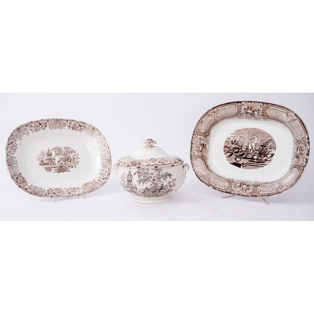 Zuppiera e due vassoi da portata in porcellana decorata.