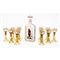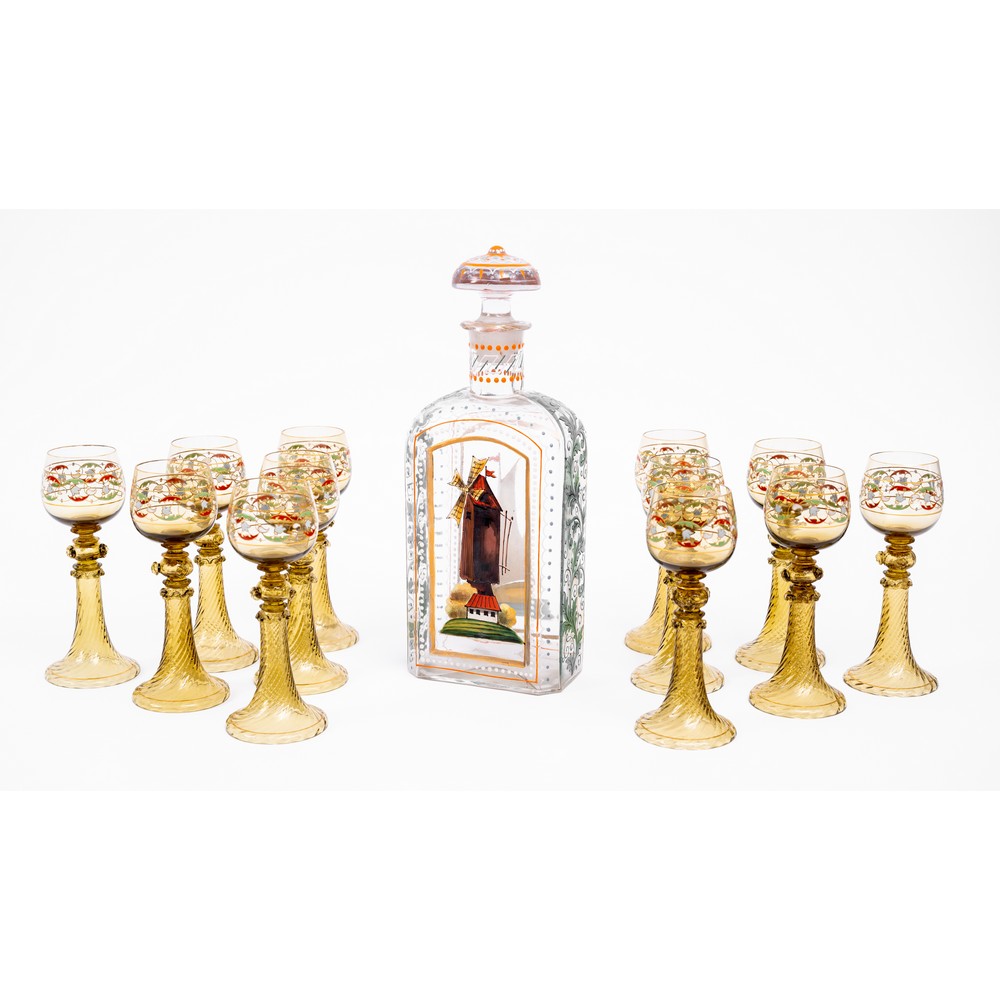 composto da bottiglia e dodici bicchieri in vetro dipinto.