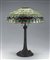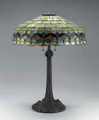 Manifattura Americana. Lampada da tavolo, base in bronzo, diffusore in vetro a piombo con un decoro di foglie stilizzate, 1900 circa. Firmata. altezza cm 61