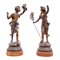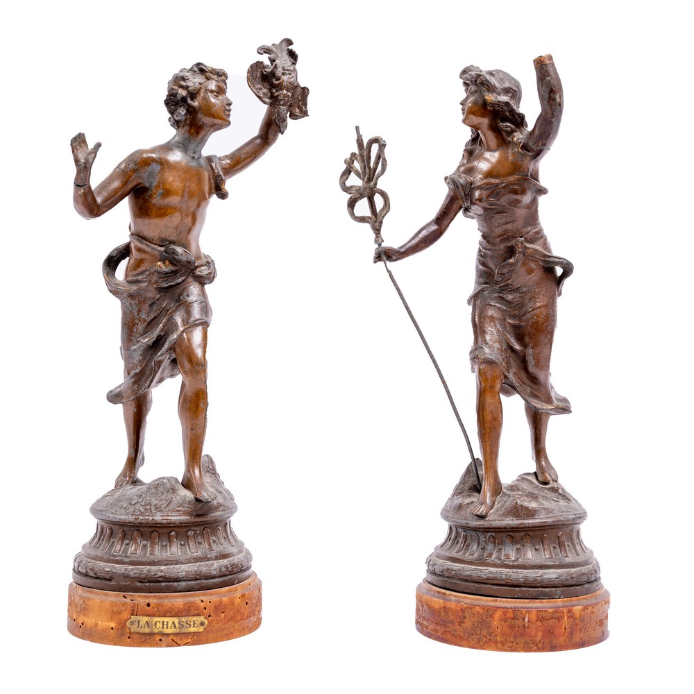 COPPIA DI SCULTURE in antimonio, raffiguranti "La caccia", base in legno (mancanze).