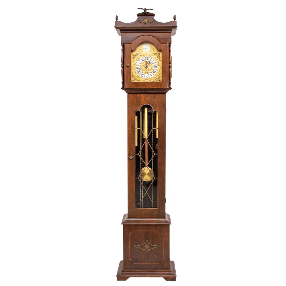 OROLOGIO A TORRE con cassa in noce, quadrante in metallo con numero romani smaltati (tempus fugi).