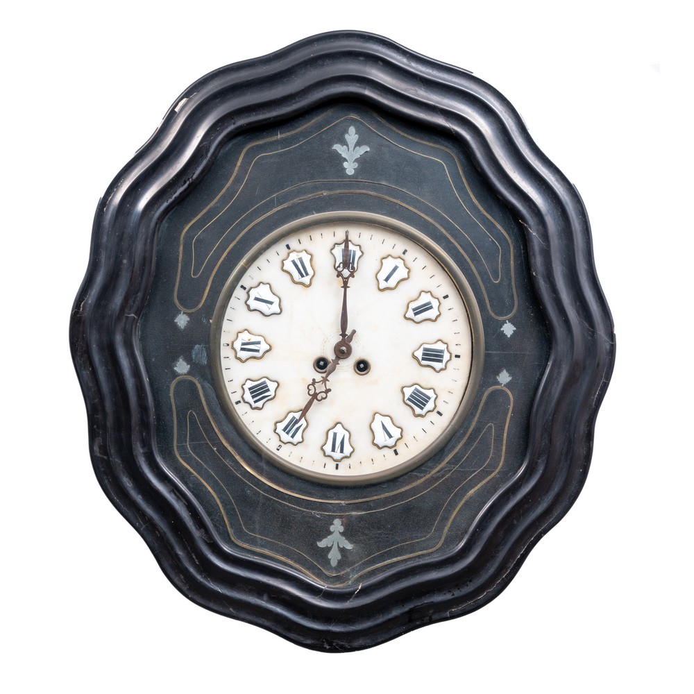 OROLOGIO da parete occhio di bue in legno con in legno e tarsie in rame, numeri romani in porcellana.