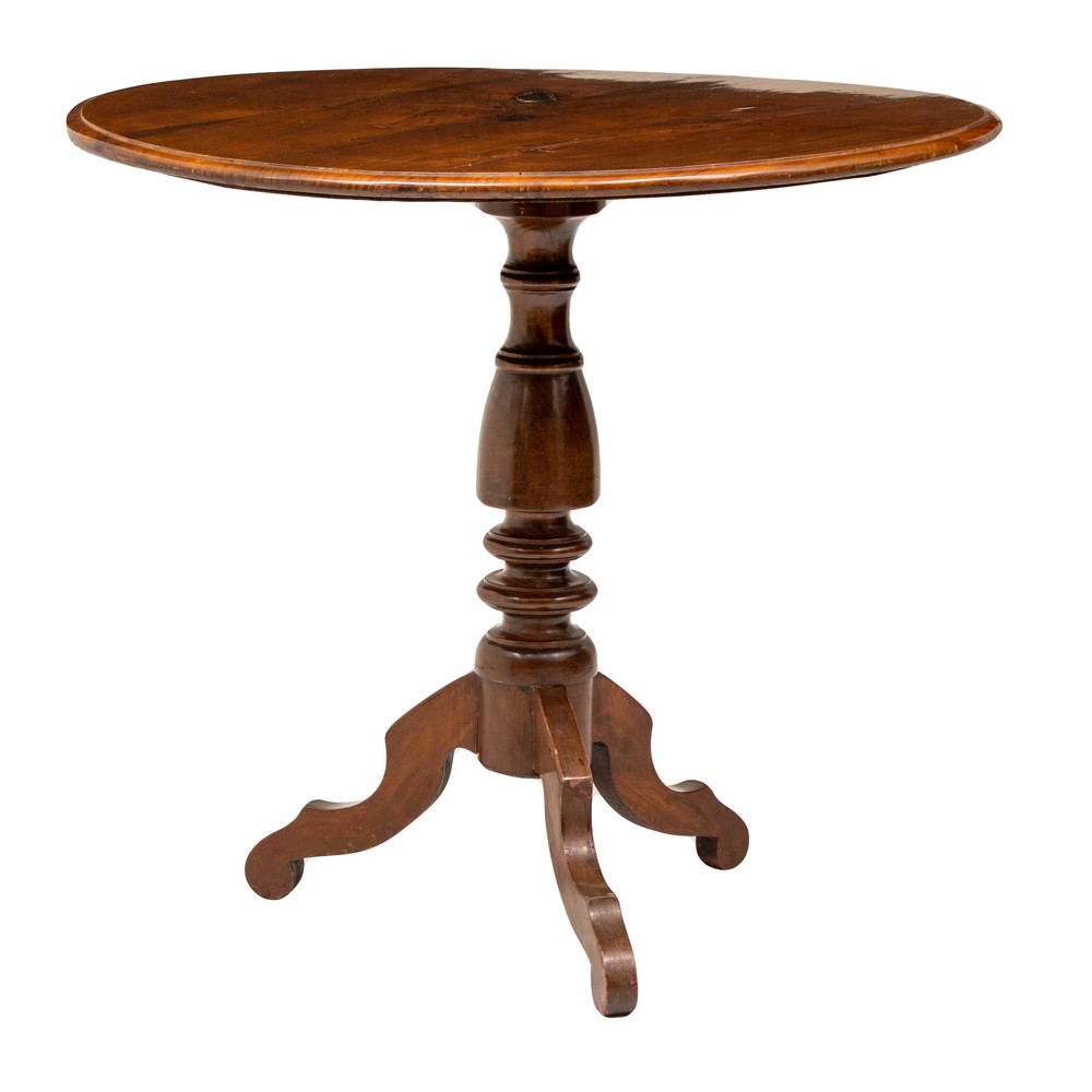 TAVOLO da centro di forma circolare in legno di noce, piede tripode.