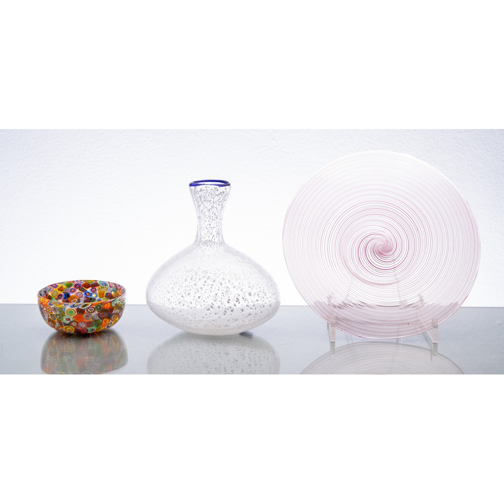 Una coppetta in vetro soffiato decorato con murrine policrome, una bottiglia in vetro incolore con inclusioni lattime, bocca piana con bordo blu, un patto in vetro rigadin trasparente e rosa.
