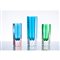 Tre vasi in vetro sommerso, corpo cubico, uno nei toni lilla e azzurro, uno trasparente e azzurro, uno trasparente e verde.