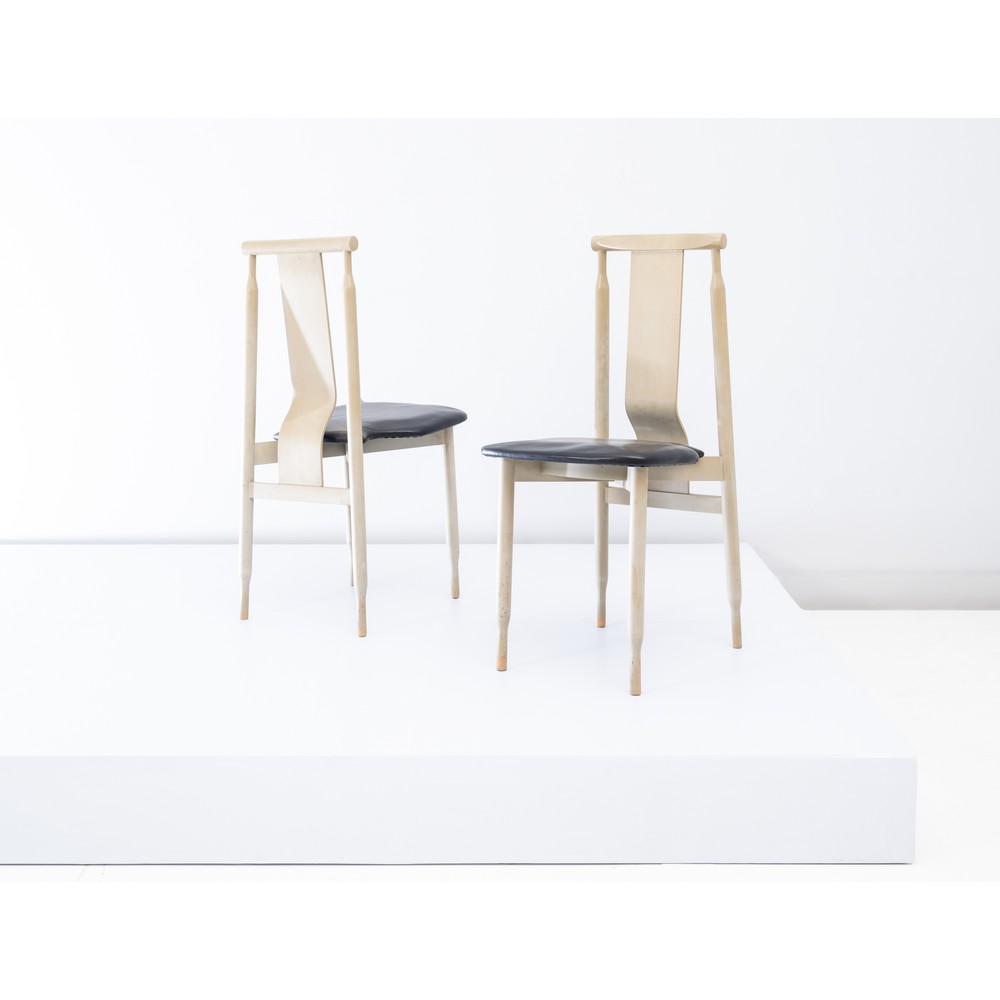 Coppia di sedie modello “Lierna”, legno massello laccato bianco, seduta in compensato imbottito in gommapiuma e rivestito in pelle naturale nera.