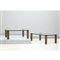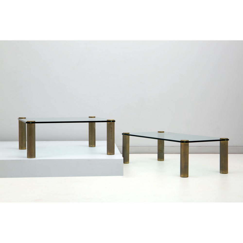 Due tavoli bassi uno rettangolare ed uno quadrato, piedi in ottone a corpo cilindrico, cristallo di grosso spessore, angoli arrotondati. Ossidazioni alle parte metalliche.