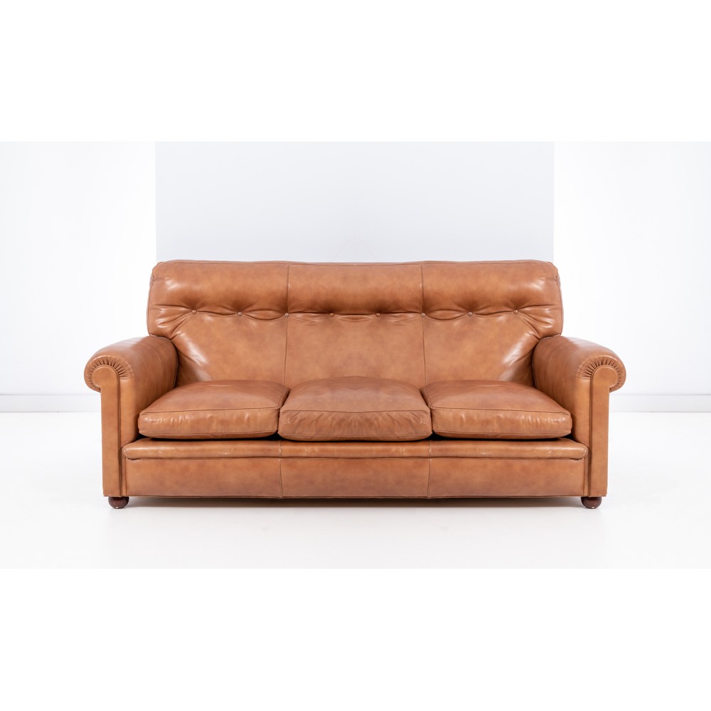 Divano a tre posti, struttura in legno con imbottitura e rivestimento in pelle cognac. Etichetta di produzione.