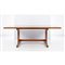 Tavolo da pranzo in legni di varie essenze, piano rettangolare, piede con crociera bassa.