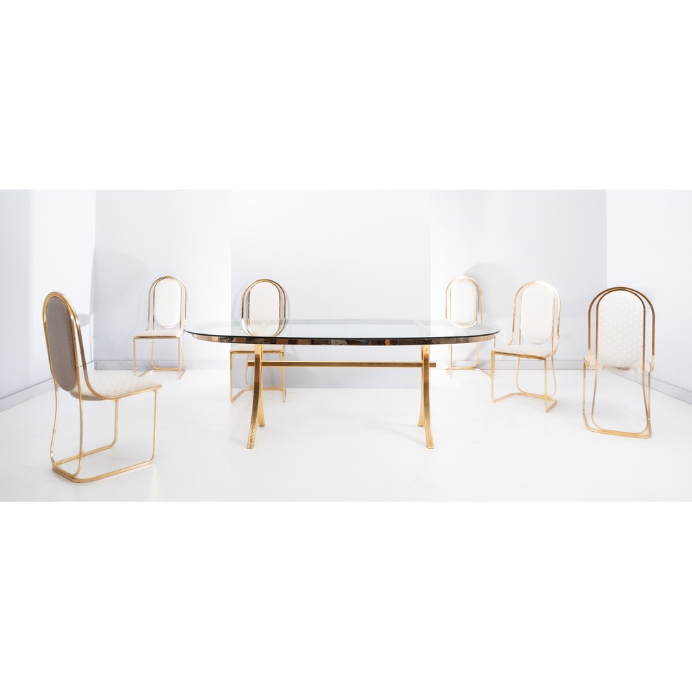 Tavolo da pranzo in metallo dorato, piano ovale in vetro trasparente, sei sedie in metallo dorato con seduta e spalliera con imbottitura e rivestite in tessuto avorio.