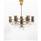 Lampada da soffitto ad otto luci in ottone composta da elementi cilindrici e diffusori in vetro trasparente.