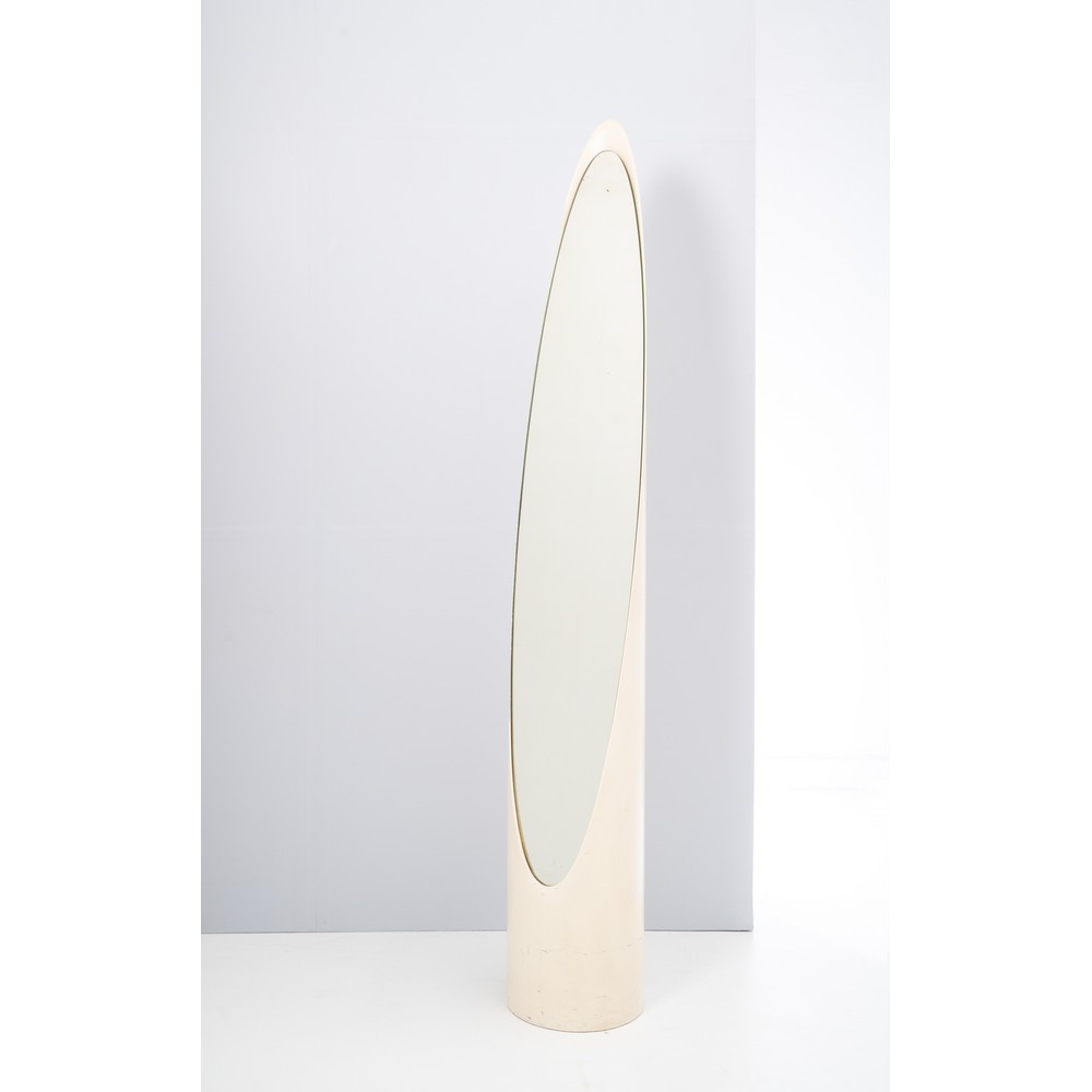 Specchio ad unghia in materiale plastico bianco, corpo cilindrico, vetro specchiato ellittico.