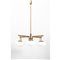 Lampada a sospensione a sei luci, struttura in ottone, diffusori luminosi sferici schiacciati in vetro satinato opalino.