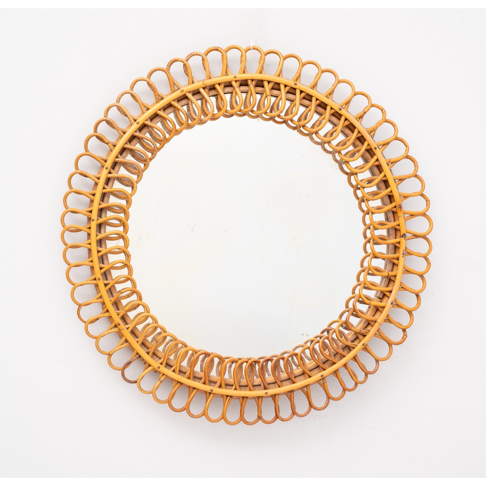 Specchio da parete in vimini, corpo circolare con vetro specchiato.