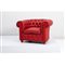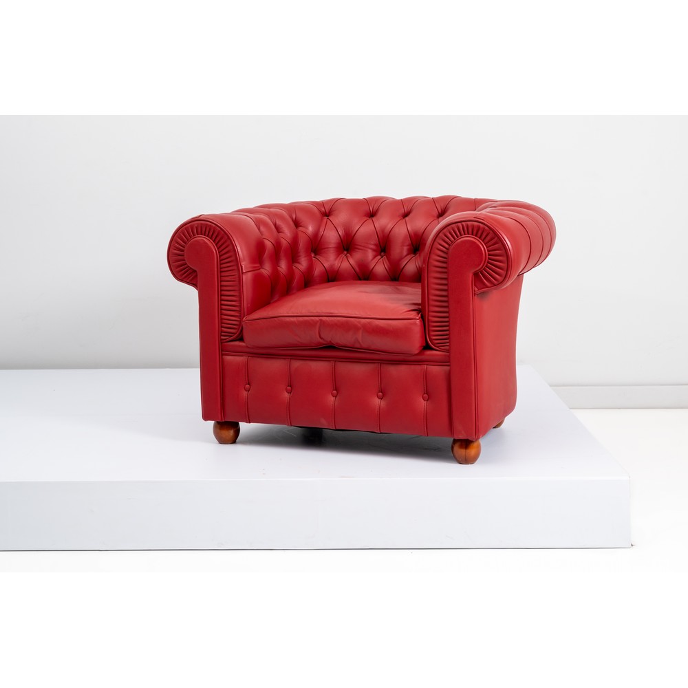 Poltrona modello “Chesterfield”, struttura in legno con imbottitura, rivestimento in pelle rossa, spalliera capitonnè.