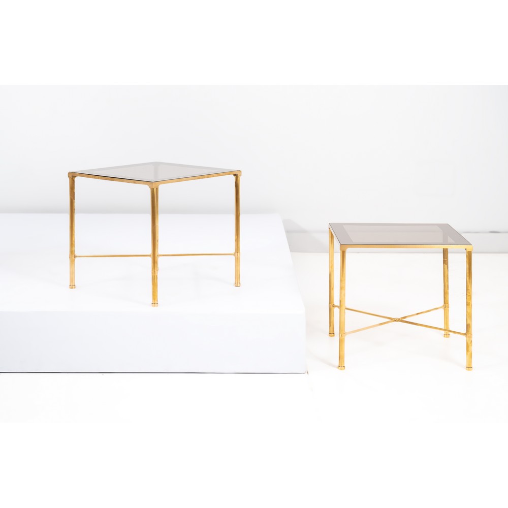 Coppia di tavoli bassi, struttura in ottone, piano quadrato in vetro fumé con bordo specchiato.