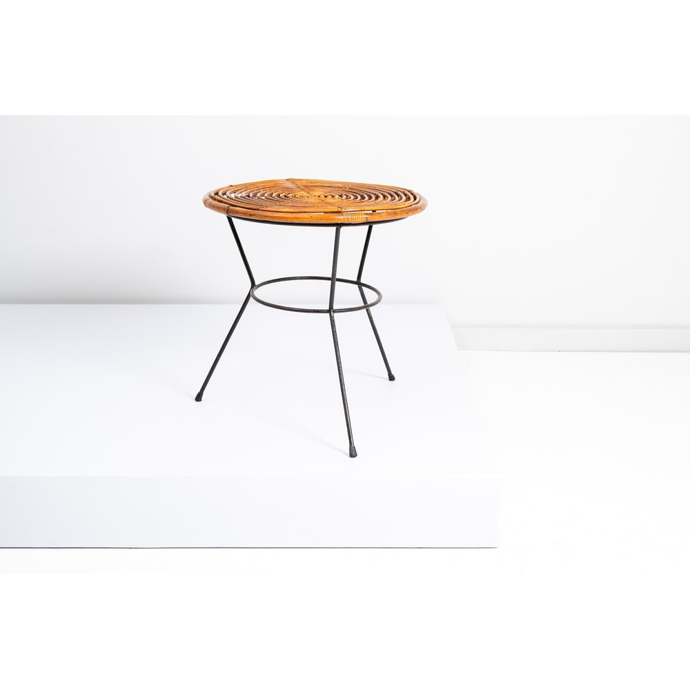 Tavolo basso, struttura in metallo verniciato nero, piede tripode, piano circolare in midollino.