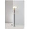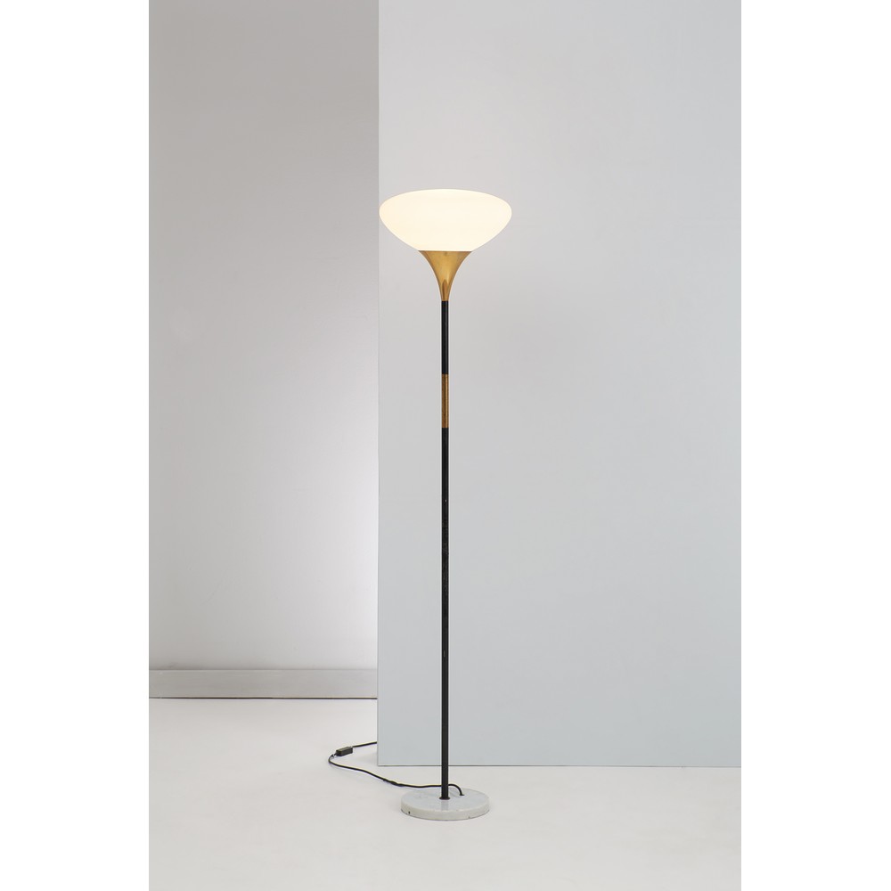 Lampada da terra con struttura in ottone e metallo laccato nero, diffusore in vetro opalino sabbiato (usure).