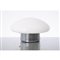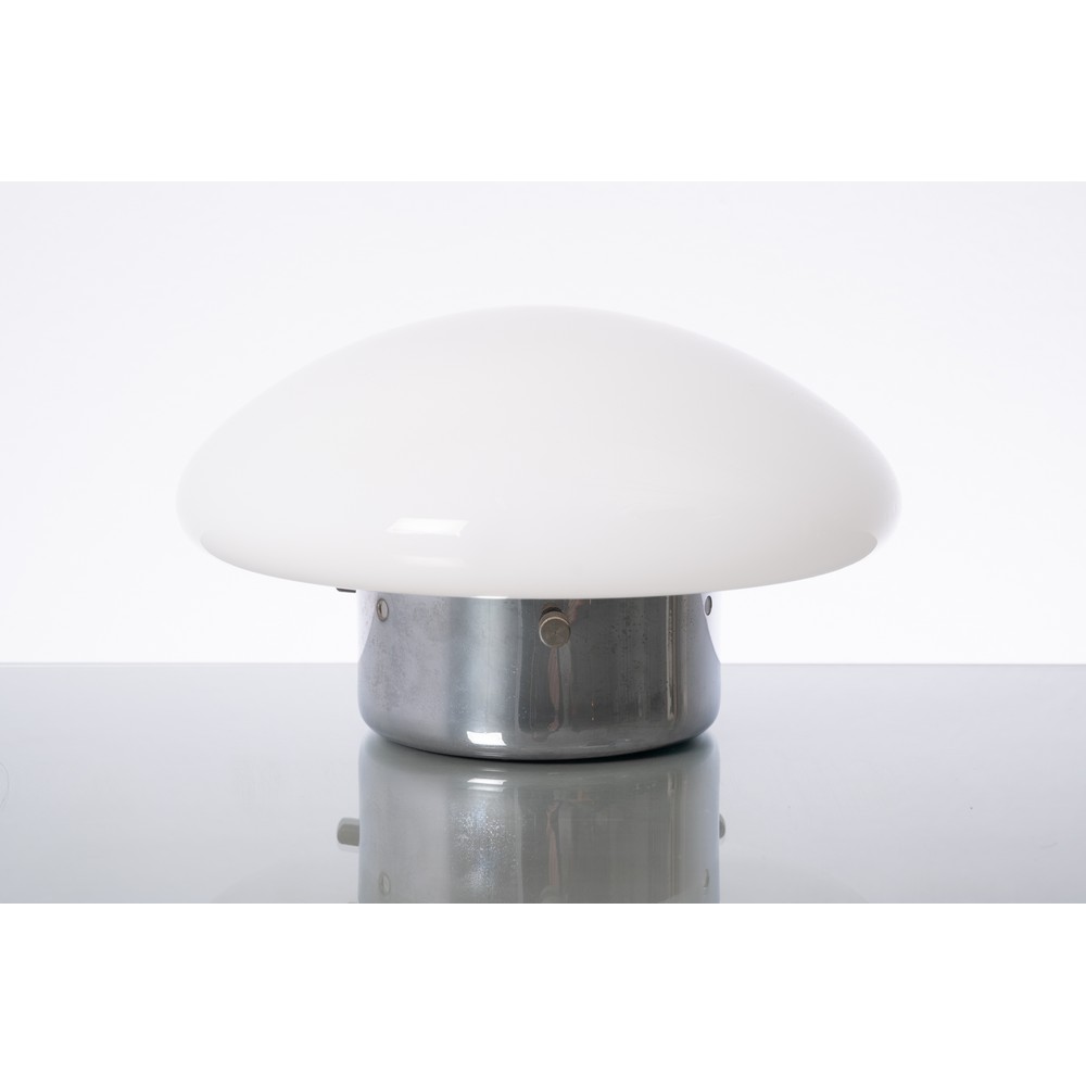 Lampada da tavolo ad una luce, struttura cilindrica in metallo cromato, diffusore luminoso in vetro opale di forma sferica schiacciata.