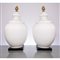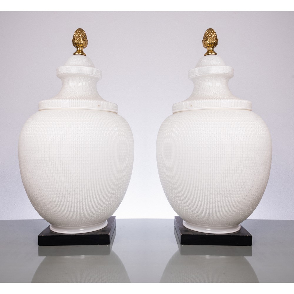 Coppia di lampade da tavolo a potiche in vetro opale, elemento di decoro a pigna sulla parte superiore, base quadrata nera.