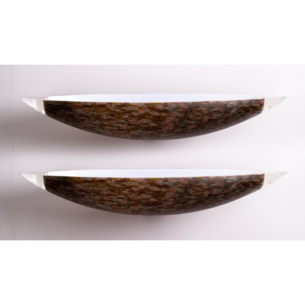 Coppia di lampade da parete ad una luce, corpo semiellittico in vetro lattimo, trasparente e con finitura ossidata.