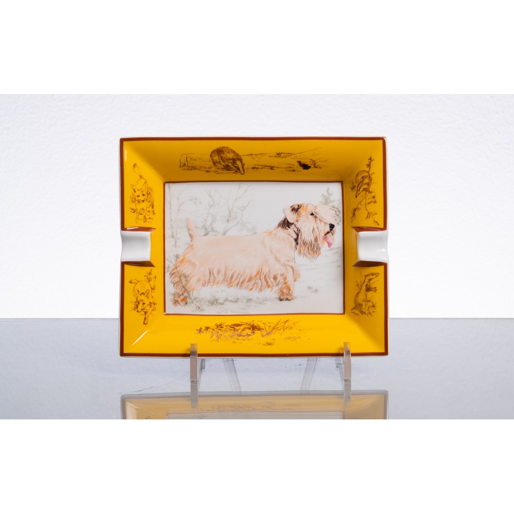 Posacenere in porcellana della serie “Cani da caccia”, corpo rettangolare con decoro raffigurante un west highland white terrier, firmato.