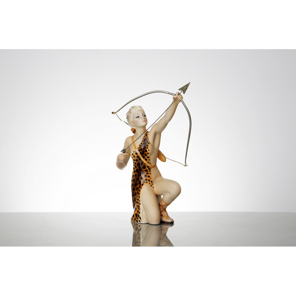 Scultura in ceramica smaltata policroma, raffigurante "Diana cacciatrice", firmata e numerata alla base.