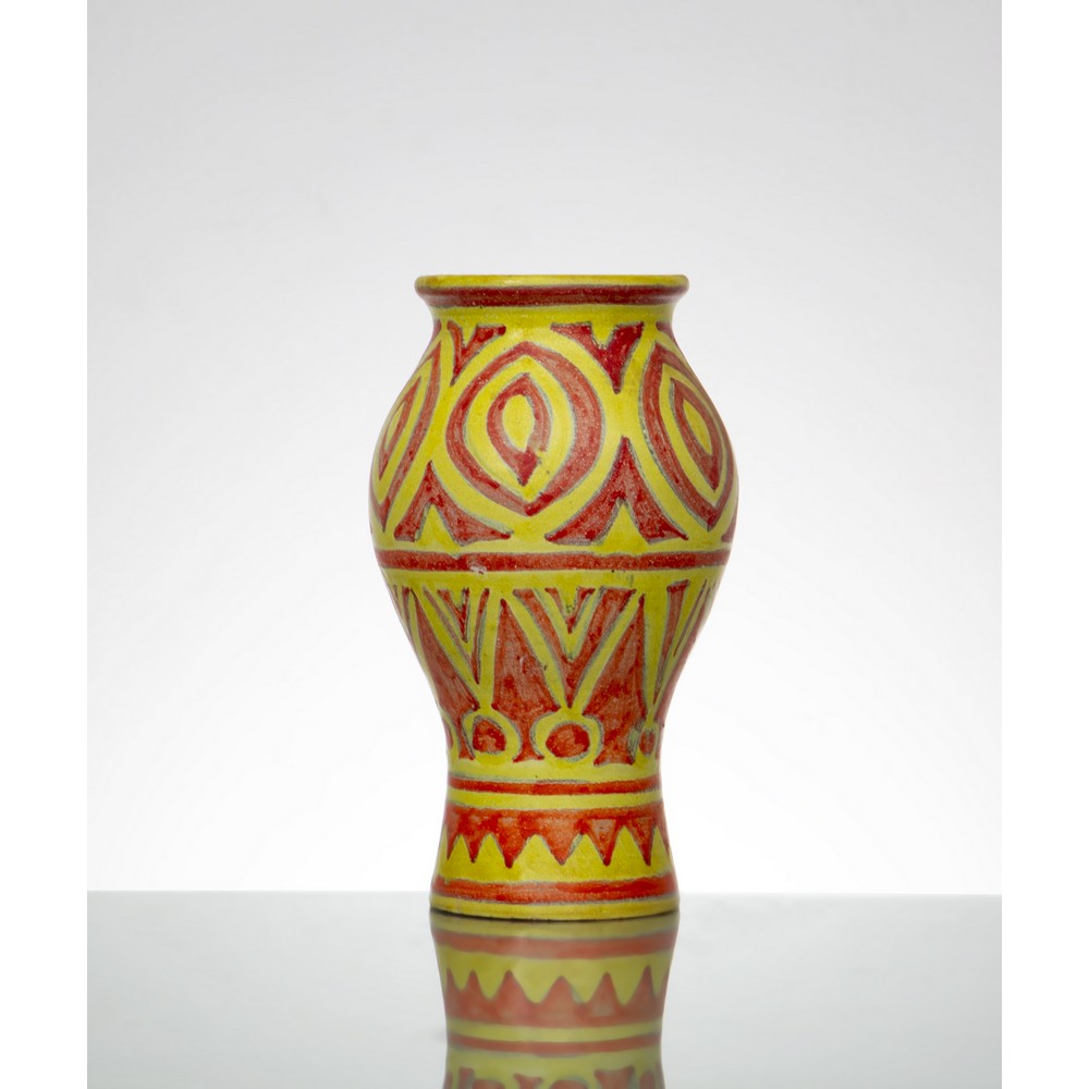 Grande vaso in ceramica decorato a motivi geometrici nei toni giallo e rosso. Etichetta alla base con numero di serie.