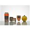 Un vaso in ceramica nei toni marrone e arancione, un fiasco con due piccole anse nei toni marrone e giallo, due posacenere raffiguranti un volatile e un felino nei toni giallo e rosso. Firma alla base.