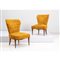 Coppia di poltrone con struttura in legno, seduta e spalliera con imbottitura e rivestimento in tessuto di damasco ocra.