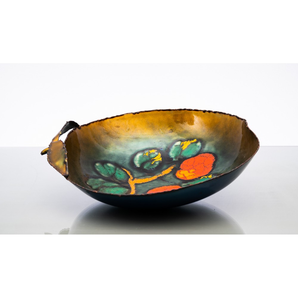 Centrotavola in rame smaltato, corpo circolare a forma di mela, decorato con frutti, nei toni verde e arancione, firma alla base.
