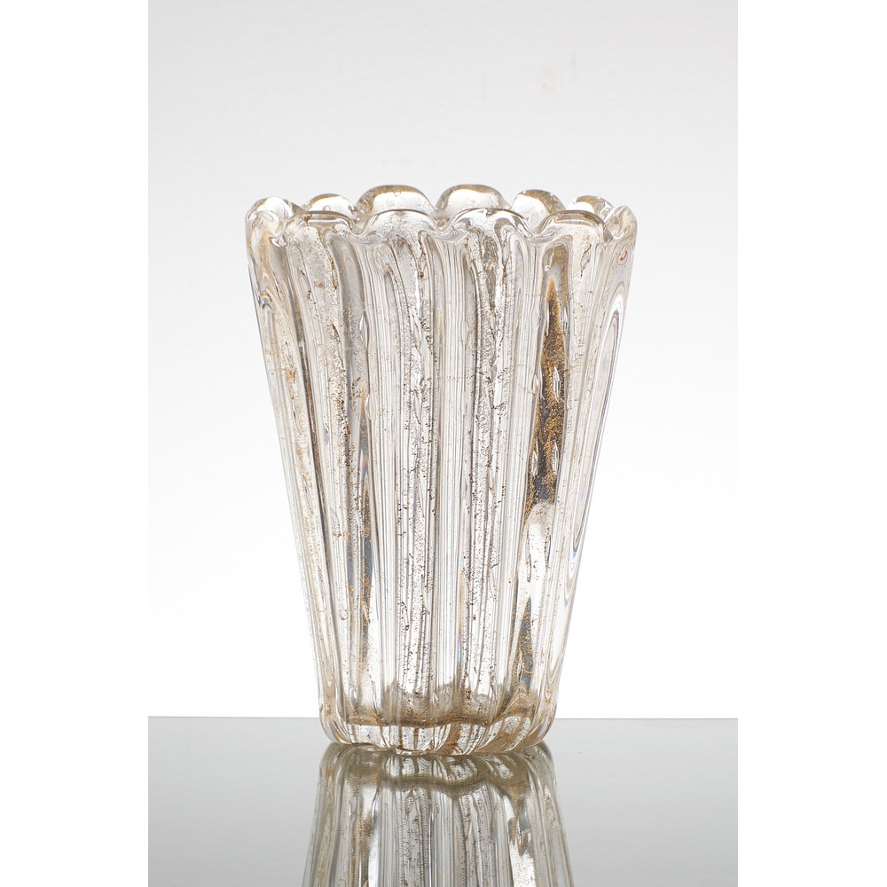 Vaso in vetro bullicante trasparente con inclusioni in oro, corpo conico con costole di vetro di grosso spessore, firmato alla base.