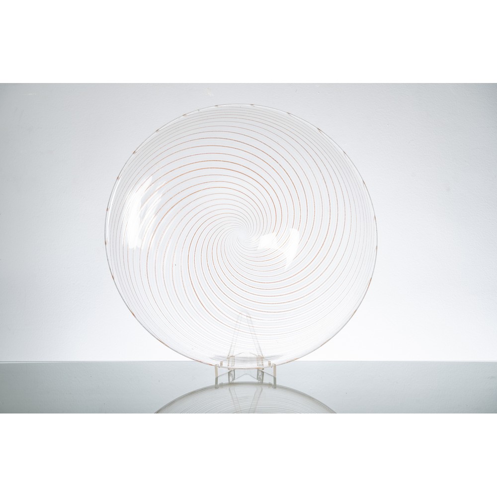 Grande piatto circolare in vetro trasparente con decoro a spirale oro. Firma sul retro.