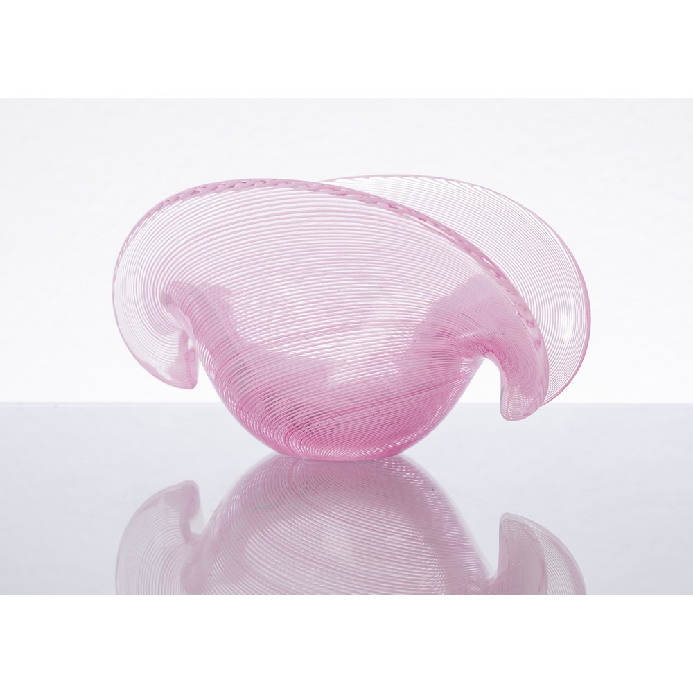 Posacenere in vetro rigadin incolore e rosa, corpo a conchiglia.