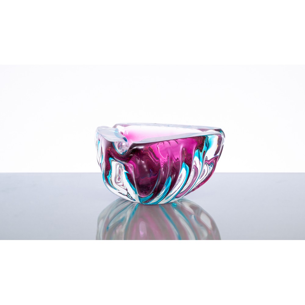 Posacenere in vetro sommerso nei toni lilla e azzurro, corpo triangolare con scanalature e sterne.