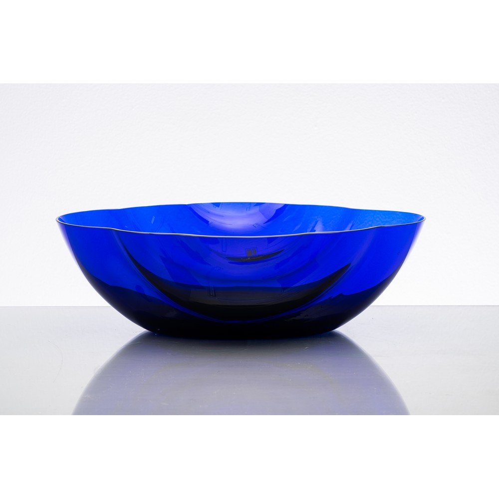 Centrotavola in vetro soffiato blu, corpo circolare, bordo piatto, firmato.