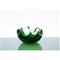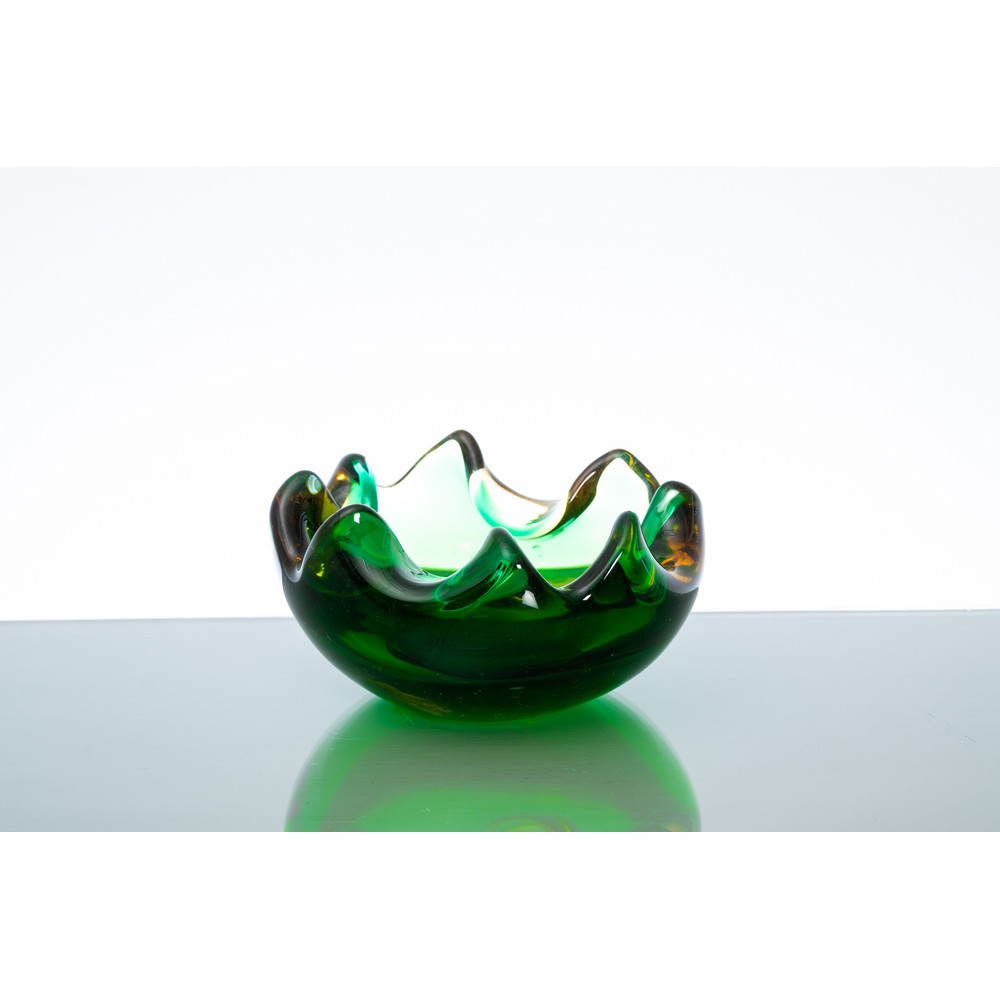 Posacenere in vetro sommerso, corpo semiglobulare, bordo ondulato, nei toni del verde e ambra.