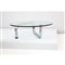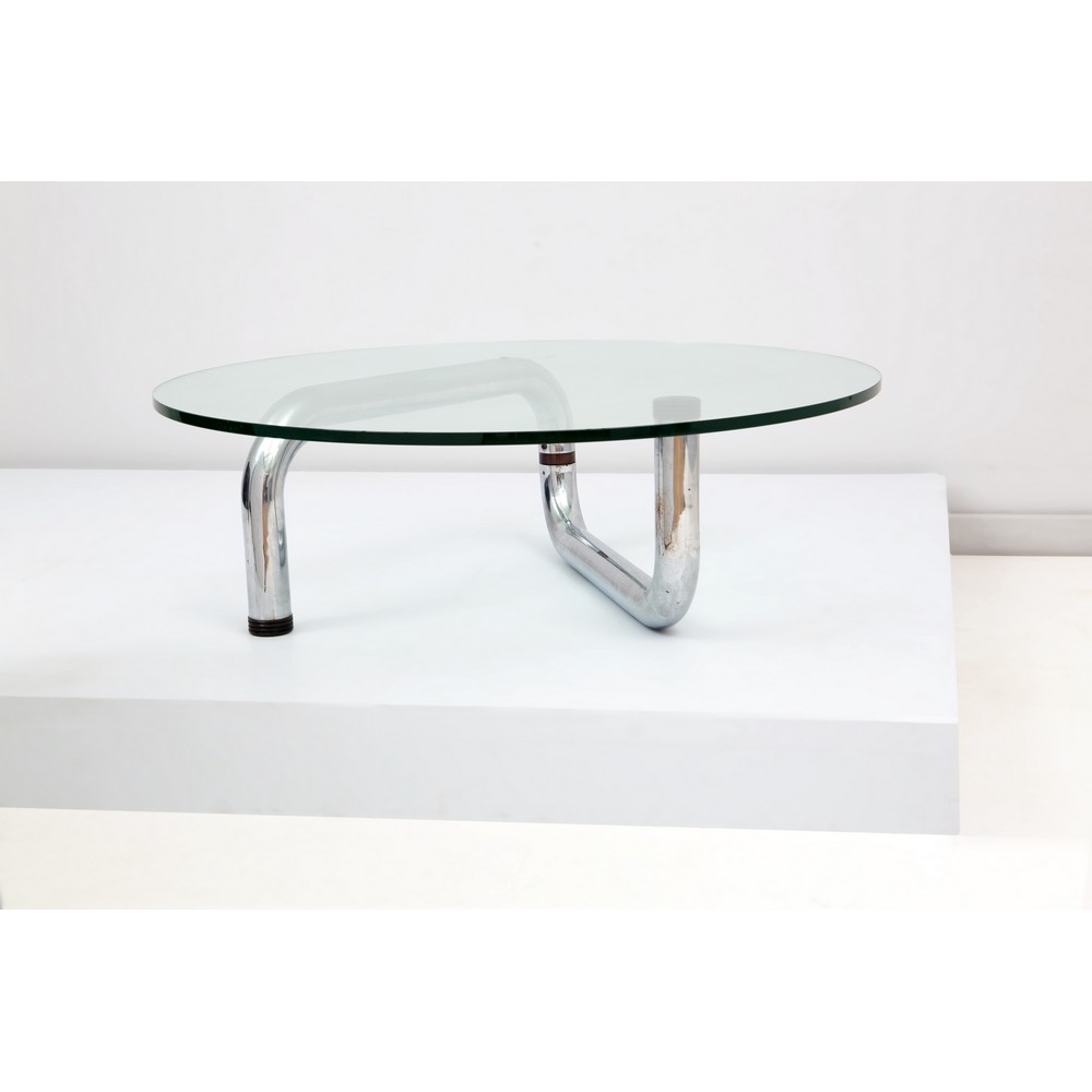 Tavolo basso, piede in tubolare di acciaio cromato con giunzioni in metallo brunito, piano circolare in vetro.