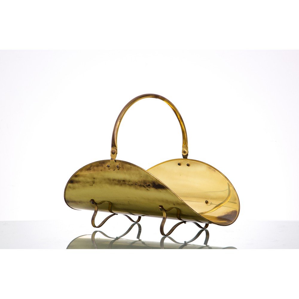 Portalegna o portariviste in ottone interamente piegato e battuto a mano. Manico tubolare inclinabile.