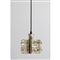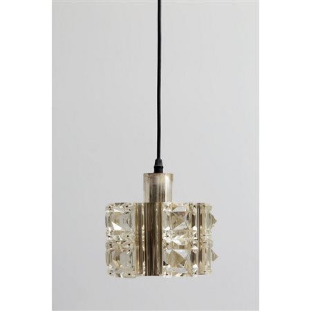 Lampada a sospensione ad una luce in acciaio cromato ed elementi quadrati in vetro trasparente sfaccettato.