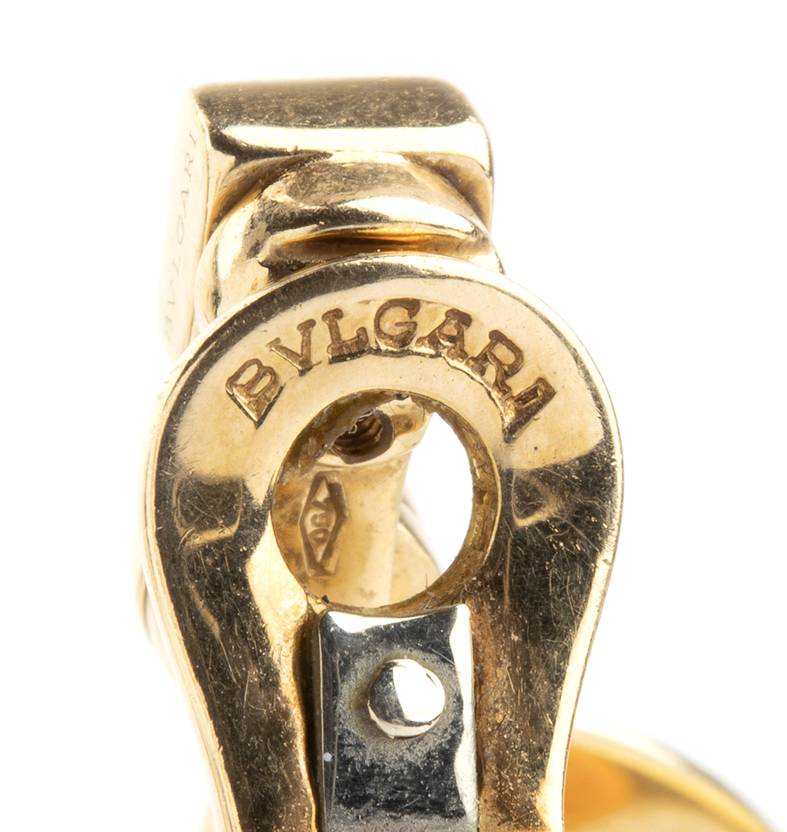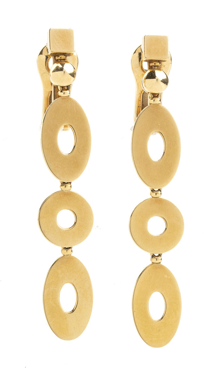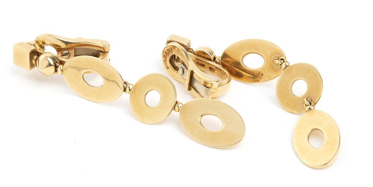 in linea di tre motivi geometrici traforati in oro giallo 18k. Punzonati "BVLGARI - Made in Italy - 750 - 2337 AL".