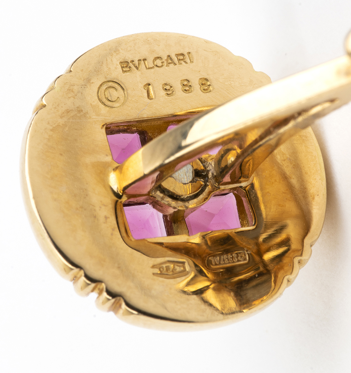 oro giallo 18k, ciascuno incastonato con totmaline e piccolo diamante. Diametro 10 mm. Punzonzto "1988 - 750 - BVLGARI - 2337 AL".